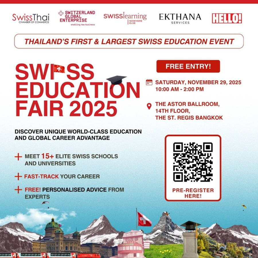 “Swiss Education Fair 2025” งานแนะแนวการศึกษาสวิตเซอร์แลนด์ครั้งยิ่งใหญ่ที่สุดในประเทศไทย ในวันเสาร์ที่ 29 พฤศจิกายน 2568 เวลา 10.00 – 14.00 น. ณ The Astor Ballroom ชั้น 14 โรงแรม เดอะ เซนต์ รีจิส กรุงเทพ