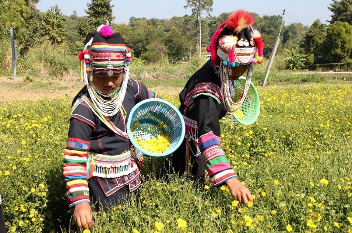 เกษตรกรในพื้นที่จะเป็นชาวไทยภูเขาเผ่าอีก้อและไทยใหญ่ ที่อพยพมาจากประเทศลาวและพม่า ซึ่งเป็นหมู่บ้านในเขตความรับผิดชอบจำนวน 5 หมู่บ้าน รวม 139 ครอบครัว ประชากร 630 คน จุดเริ่มต้น ในการแปรรูป ดอกคาโมมายล์ และดอกเก๊กฮวย (เหลืองสะโงะ) อบแห้งเพื่อจำหน่ายให้ฝ่ายการตลาดและโรงงานแปรรูปของโครงการหลวงเพื่อนำไปแปรรูปเพื่อเพิ่มมูลค่า จึงเริ่มจากโครงการหลวงสะโงะ ที่ส่งเสริมให้เกษตรกรเพาะปลูกพืชผักเมืองหนาว แต่เนื่องจากศูนย์ฯ อยู่ในพื้นที่ต่ำ หรือสูงกว่าระดับน้ำทะเลเพียง 500 เมตร จึงไม่เหมาะสมกับการเพาะปลูกพืชเมืองหนาว อีกทั้งดินยังมีความเป็นกรด จึงทำให้เกษตรกรมีพืชทางเลือก สำหรับการเพาะปลูกได้น้อย จนมีการทดลองที่ส่งเสริมให้ปลูกชาดอกไม้ (ดอกคาโมมายล์) จนพบว่าผลผลิตมีคุณภาพดี มีการแปรรูปส่งให้ฝ่ายการตลาดของมูลนิธิโครงการหลวงเป็นผู้จำหน่าย ทั้งยังเป็นวัตถุดิบสำหรับการแปรรูป ให้เป็นผลิตภัณฑ์ในรูปแบบอื่นๆ (ตามที่กล่าวมาข้างต้น) โดยศูนย์พัฒนาโครงการหลวงสะโงะรับซื้อดอกคาโมมายล์สดจากเกษตรกรในราคากิโลกรัมละ 50 – 55 บาท (ใช้คาโมมายล์สดประมาณ 10 กิโลกรัม สามารถอบคาโมมายล์แห้งได้ 1 กิโลกรัม)