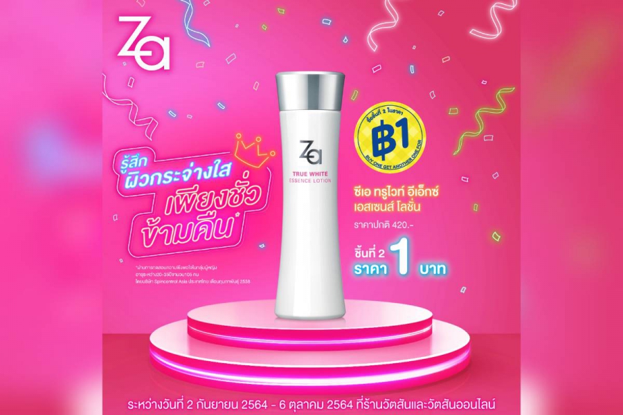 *พบกับโปรโมชั่นสุดพิเศษ Za True White EX Essence Lotion n ชิ้นที่ 1 ราคา 420 บาท และชิ้นที่ 2 ราคา 1 บาทเท่านั้น ที่ร้านวัตสันและวัตสันออนไลน์ ตั้งแต่วันที่ 2 ก.ย. 64 – 6 ต.ค. 64*