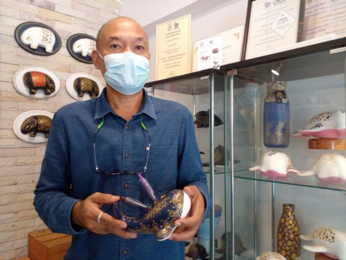 จุดที่ 2 ผลิตภัณฑ์จากกระดาษเหลือใช้ “Paper Art Thai” อำเภอเมือง จังหวัดสมุทรสาคร ซึ่งมีนาย มานะทองสุข ประธานกลุ่ม Paper Art Thai อันเป็นผลิตภัณฑ์จากกระดาษเหลือใช้ ฉีกกรอบงานเปเปอร์มาเช่ แบบเดิมๆ ให้มีความโดดเด่นที่การคิดค้นเทคนิคการผลิตแบบเฉพาะ ทำให้ชิ้นงานมีพื้นผิวเนียนเรียบประดุจงานเซรามิค แต่มีน้ำหนักเบา ทนทาน สามรถย่อยสลายได้ตามธรรมชาติ ก่อนที่จะใช้สีเพ้นท์ที่เป็นมิตรกับสิ่งแวดล้อม ผ่านฝีมือช่างเขียนลายเฉกเช่นงานเขียนลายเบญจรงค์น้ำทอง หัตถศิลป์ชั้นสูงของจังหวัดสมุทรสาคร สนใจสั่งซื้อผลิตภัณฑ์ได้ที่ http://www.paperartthai.com/ โทร 090-982-1259
