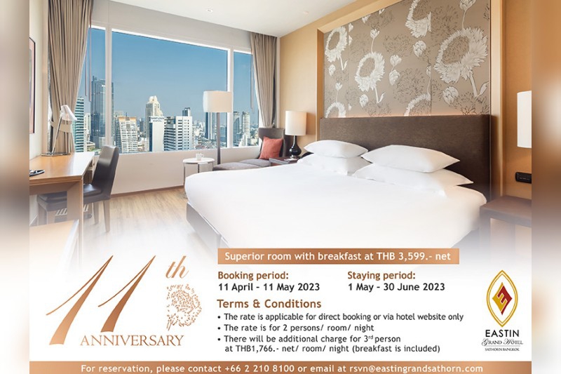 เนื่องในโอกาสครบรอบ 11 ปี ของโรงแรมอีสติน แกรนด์ สาทร กรุงเทพฯ ทางโรงแรมขอตอบแทนลูกค้าที่ให้การสนับสนุนโรงแรมมาตลอด 11 ปี ด้วยโปรโมชั่นราคาพิเศษสำหรับบุฟเฟต์และห้องพัก โดยแกรนด์วีคเอนบุฟเฟต์ บุฟเฟต์อาหารทะเลและอาหารนานาชาติที่ได้รับความนิยมมาอย่างยาวนาน ที่สุดของความอร่อยและที่สุดของความคุ้มค่า มื้อเสาร์เย็นหรืออาทิตย์กลางวัน จากราคาเต็ม 1,950 บาท ทางโรงแรมขาย E-Voucher 111 ใบ เพียง 1,111 บาท ขายวันที่ 4 พฤษภาคม วันเดียว เท่านั้น